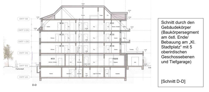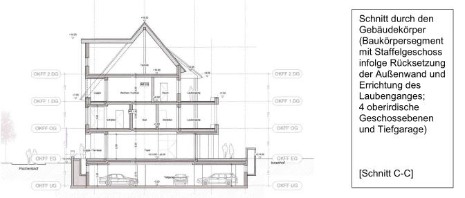 Im Bauantrag mit ablehnender „bauplanungsrechtlichen Stellungnahme“ des Stadtplanungsamtes vom 20.01.2021 und der aktuell am Bauzaun befindlichen Ansicht sind deutlich 3 Vollgeschosse (Schnitt D-D) und ein Staffelgeschoss (Schnitt C-C) zu erkennen.
